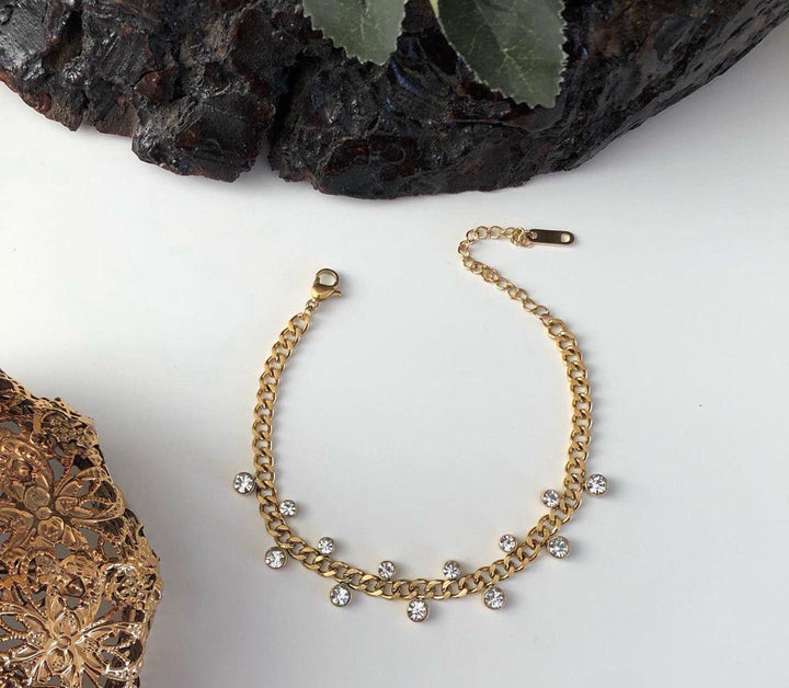 سوار ذهبي أنيق مزين بحبات كريستال شفافة تضفي لمسة فاخرة وعصرية. مطلي بالذهب عيار 18 مكفول سنة لتغير اللون.