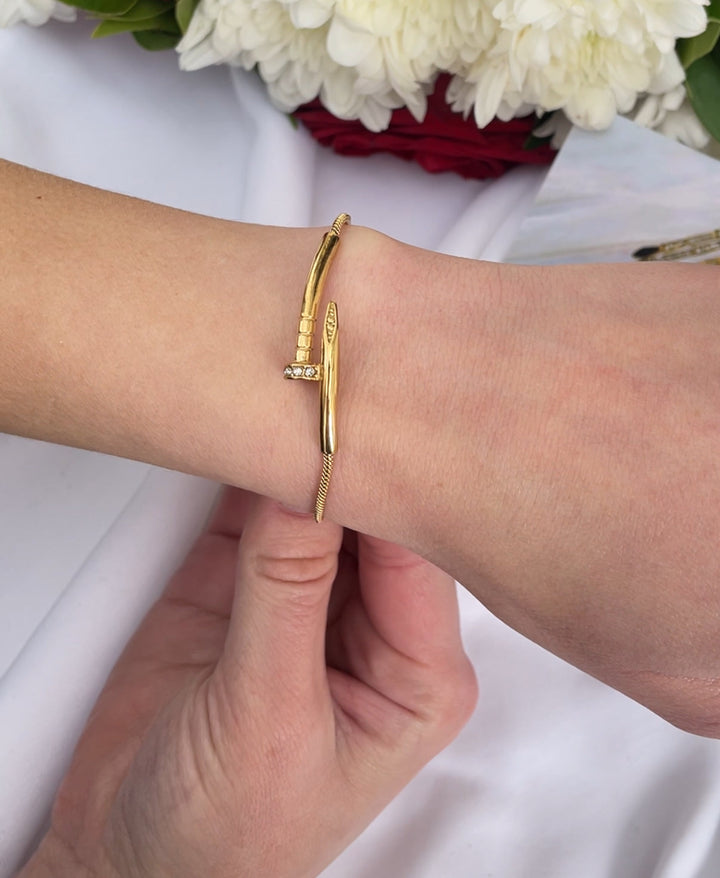 سوار أنيق بتصميم مسمار ذهبي مع لمسات من الأحجار الصغيرة اللامعة، يضفي لمسة عصرية وفاخرة على معصمك. مطلي بالذهب عيار 18 مكفول سنة لتغير اللون.