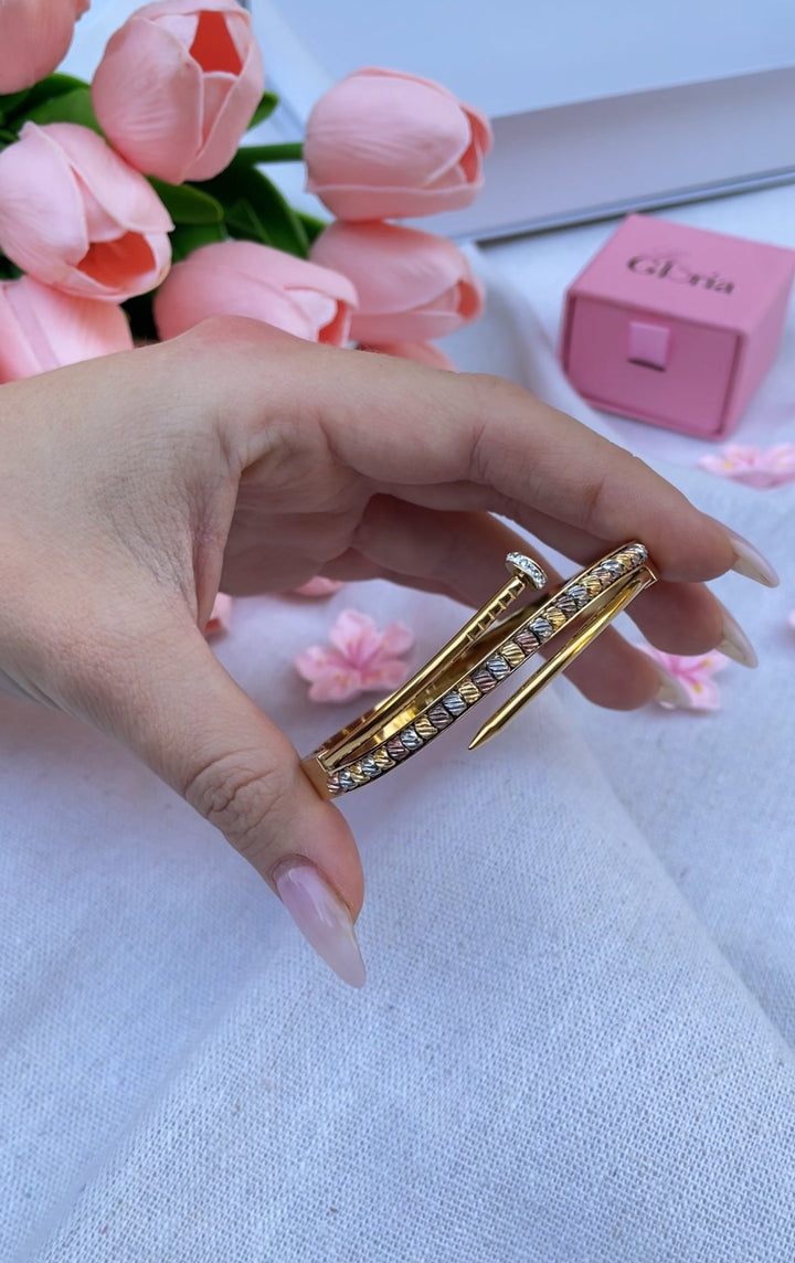 سوار أنيق بتصميم مسمار مميز مع لمسات من الذهب الأبيض والوردي على الذهب الأصفر، يضفي مظهراً عصرياً وجذاباً. مطلي بالذهب عيار 18 مكفول سنة لتغير اللون.