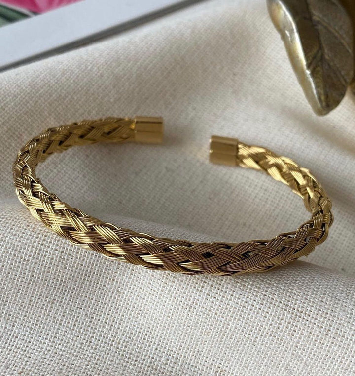 سوار أنيق بتصميم مضفر ذهبي يضفي لمسة كلاسيكية وعصرية على معصمك. مطلي بالذهب عيار 18 مكفول سنة لتغير اللون.