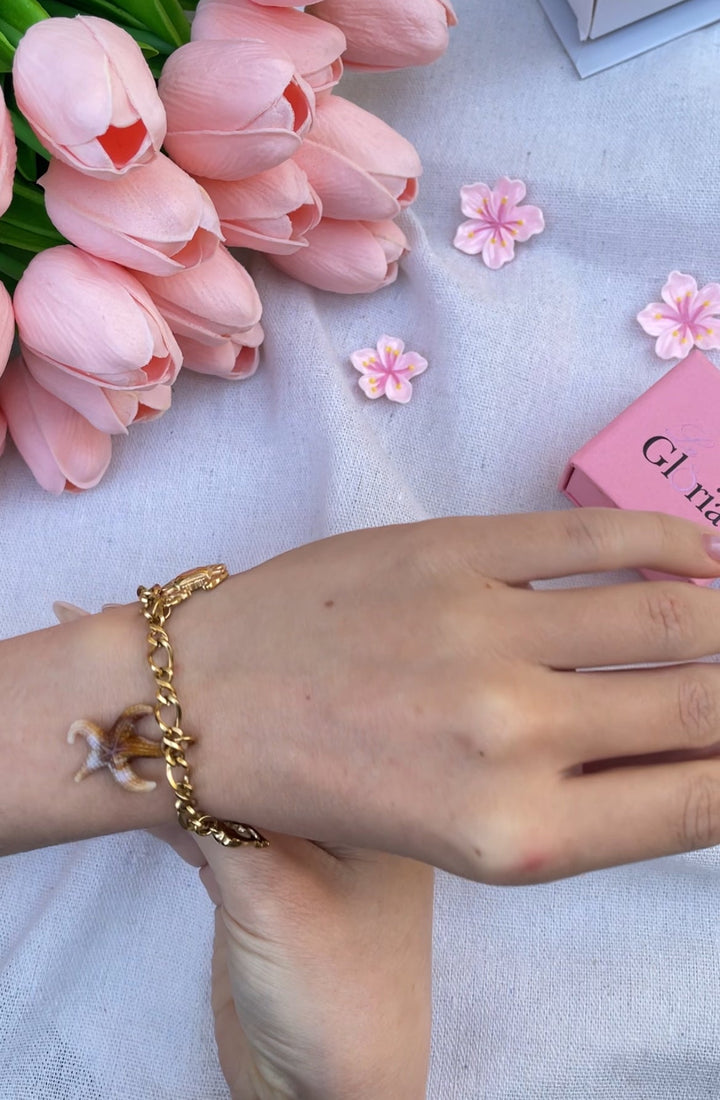 سوار أنيق مطلي بالذهب مع تعليقة على شكل نجمة البحر بلون طبيعي دافئ يضفي لمسة بحرية عصرية. مطلي بالذهب عيار 18 مكفول سنة لتغير اللون.