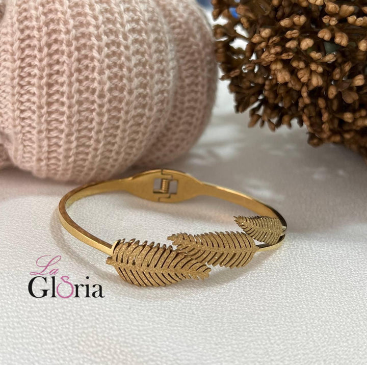 سوار أنيق مطلي بالذهب مع تصميم ريشة متداخل يعطي مظهراً ناعماً وجذاباً باللون الذهبي اللامع. مطلي بالذهب عيار 18 مكفول سنة لتغير اللون.