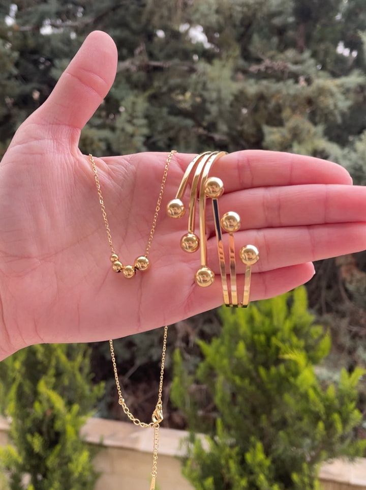 طقم الببلز الناعم يجمع بين البساطة والأناقة في تصميم متناغم يعكس حيوية ونضارة الإطلالة. السلسلة الذهبية الرقيقة تتزين بعدة خرزات دائرية صغيرة تلتف بتناسق لتضفي لمسة ناعمة وعصرية حول العنق. السوار المصمم بأساور متعددة ينثر دوائر معدنية بارزة على الأطراف، ليمنح المعصم جمالية متجددة تجمع بين الانسيابية واللمعان. الطقم بالكامل بلون ذهبي ناعم يبرز تفرد التفاصيل في كل قطعة ويضفي رونقاً راقياً لا يزول. مطلي بالذهب عيار 18 مكفول سنة لتغير اللون.