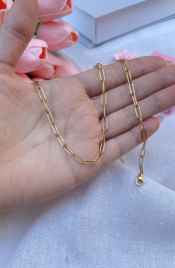 طقم البيبر كليب يتميز بتصميم متناسق يجمع بين البساطة والأناقة، ليمنح إطلالة عصرية راقية تناسب مختلف المناسبات. السلسلة مصممة بسلاسل على شكل حلقات بيبر كليب متصلة بشكل متوازن يبرز جمال التشكيلة، كما أن السوار يحمل نفس التصميم ليكمل الطقم بتناسق مثالي. جميع القطع بلون ذهبي ناعم يضفي لمسة دافئة من الأناقة، وخالٍ من أي زينة أو أحجار مما يبرز النظافة والبساطة في التصميم. مطلي بالذهب عيار 18 مكفول سنة لتغير اللون.
