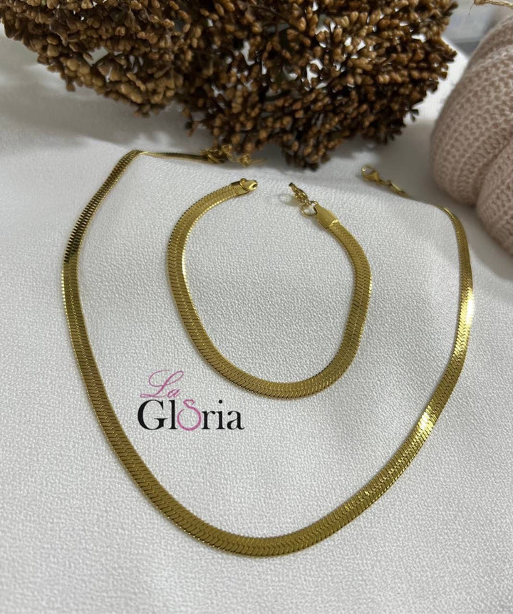 طقم التيفاني سترس يتألق بتناغم مميز بين سلسلته وسواره اللذين يحملان تصميمًا متصلًا أنيقًا بألوان ذهبية براقة تعكس ذوقًا رفيعًا في اختيار المجوهرات. السلسلة تتميز بخطوط متداخلة تتخذ شكل الحراشف المتراصة بعناية، مما يمنحها مظهراً انسيابيًا وجذابًا يلف الرقبة بأناقة بسيطة وعصرية. أما السوار فيحاكي نفس التصميم لينسجم تمامًا مع السلسلة، مما يمنح اليد لمسة من التميز والنعومة البصرية. اللون الذهبي الناعم مع تفاصيل متقنة تعزز من فخامة الطقم وتجعله مثالياً للارتداء اليومي والمناسبات الخاصة على حد سواء. مطلي بالذهب عيار 18 مكفول سنة لتغير اللون.