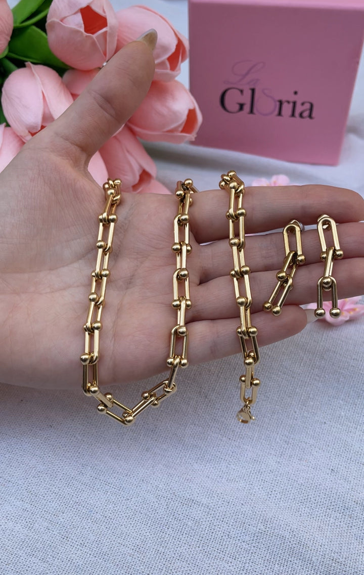 طقم التيفاني كامل يتألق بتناسق تصميمه العصري البسيط الذي يجمع بين الأناقة واللمسة العصرية في آن واحد. السلسلة الذهبية تتميز بحلقات مستطيلة متصلة مع كرات دقيقة متناثرة تعطي بريقاً فريداً ومميزاً. السوار ينسجم مع تصميم السلسلة بحلقاته الممدودة والكرات الموزعة بشكل متناغم، ما يجعل مظهر اليد راقياً وجذاباً. الحلقان ذات التصميم المتناسق مع الطقم، تأتي بشكل مستطيلات متصلة مزينة بكرات صغيرة تضيف تأثيراً جميلاً وهادئاً حول الأذن. الطقم باللون الذهبي اللامع الذي يبرز تفاصيله الدقيقة مع لمسة أنثوية راقية. مطلي بالذهب عيار 18 مكفول سنة لتغير اللون.