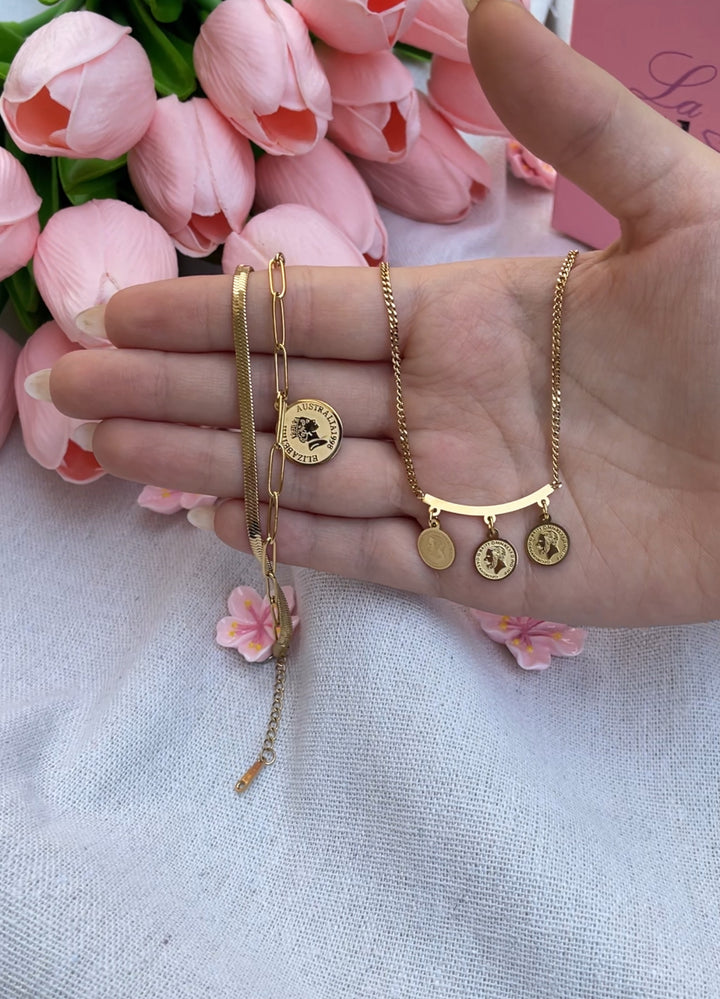 طقم الليرات الرشرش يأسر الأنظار بتصميمه المتناغم الذي يجمع بين العصرية والكلاسيكية في قالب ذهبي أنيق. السلسلة تتميز بحبات ليرات معلقة على قضيب منحني يضفي لمسة فريدة من الحيوية على الرقبة، بينما يعكس السوار تباين التفاصيل بين سلسلة مسطحة ناعمة وسلسلة ذات حلقات مستطيلة مع ليرة معلقة تُضيف عنصر الحركة والزينة المتجددة. الطقم مطلي بالذهب عيار 18 مكفول سنة لتغير اللون.