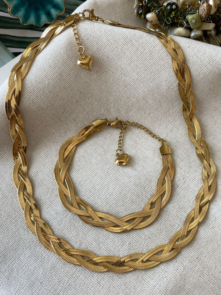 طقم المجدل ذهبي بتصميم أنيق ومتناسق يجمع بين الفخامة والبساطة في آن واحد. السلسلة بتصميم مضفر بارز يبرز بريقه الذهبي اللافت، بينما يأتي السوار بتصميم منسجم مع السلسلة، مزين بسلسلة إضافية تحمل قلادة قلب صغيرة تضيف لمسة رومانسية ناعمة. الطقم بالكامل بلون ذهبي دافئ يضفي رونقاً راقياً، ويتميز بتشطيب ناعم يجمع بين العصرية والكلاسيكية. مطلي بالذهب عيار 18 مكفول سنة لتغير اللون.
