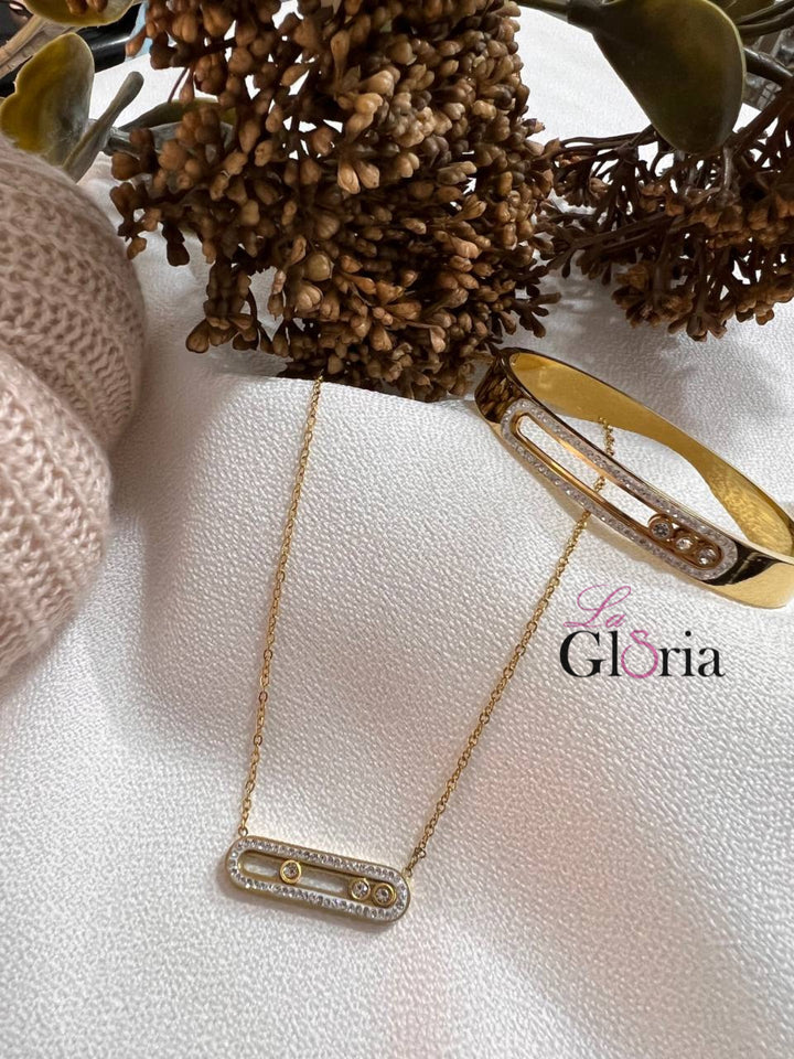 طقم الميسكا يتألق بتناسق رائع يجمع بين البساطة والأناقة العصرية، حيث تتناغم قطع السلسلة والسوار بشكل متناغم يكمل كل منها الآخر. السلسلة الذهبية الدقيقة تتميز بقلادة مستطيلة الشكل مفتوحة التصميم مزينة بحواف من أحجار الزيركون اللامعة وسطها نقطتان من الأحجار المضيئة تضيف لمسة من التميز والرقي. السوار الذهبي المصقول يأتي بتصميم متناسق يعكس روح السلسلة بفتحات مستطيلة ونقاط الحجر التي تخلق توازنًا بصريًا أنيقًا. الطقم بألوانه الذهبية الناعمة يضفي لمسة من الفخامة الراقية التي تناسب كافة المناسبات. مطلي بالذهب عيار 18 مكفول سنة لتغير اللون.