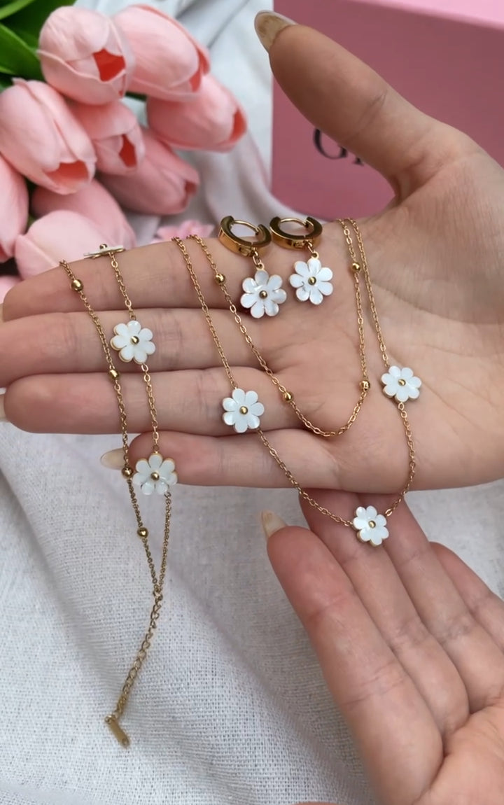 طقم الورد الأبيض الطبقتين يتميز بتصميمه الرقيق والمتناسق الذي يجمع بين البساطة والأناقة في كل قطعة، مما يمنحه لمسة ناعمة تناسب كل المناسبات. السلسلة ذات الطبقتين تزدان بزهور بيضاء صغيرة بتفاصيل دقيقة وسط بلون ذهبي ناعم، تضفي إحساساً بالأنوثة والنعومة. السوار بخطين رفيعين يشبهان السلسلة مزين بنفس الزهور البيضاء المتوزعة بعناية، مما يعزز الشعور بالتكامل بين القطع. الحلق على شكل أقراط هوب صغيرة تحمل زهرتين بيضاء تضيفان لمسة حيوية وخفيفة للوجه. جميع القطع متجانسة في اللون والتصميم، مع لمسات ذهبية دقيقة تحيط بالزهور البيضاء لتعزز من جاذبية الطقم.