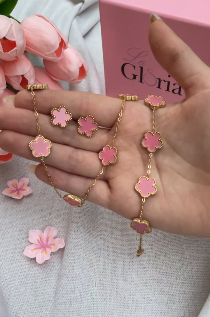 طقم الورود الزهري بتصميم متناسق يجمع بين الأناقة والنعومة في تناغم راقٍ يبرز جمال كل قطعة بمفردها ومعاً. السلسلة تتميز بسلسلة ذهبية رفيعة مزينة بزهور أنيقة وردية بأطراف مفرغة تعكس الحس الأنثوي الرقيق. السوار يأتي بنفس تصميم الزهور الموزعة بشكل متقن على طول السلسلة ليضفي لمسة من الرقة على المعصم. الحلق أيضاً مزين بنفس الأزهار الوردية الصغيرة التي تتناغم مع الطقم بشكل مثالي، ما يمنح مظهراً متكاملاً وحيوياً. جميع القطع مصنوعة باللون الذهبي مع لمسات وردية ناعمة تحاكي ألوان الزهور الطبيعية لتجسيد أرقى معاني الجمال والأنوثة. مطلي بالذهب عيار 18 مكفول سنة لتغير اللون.