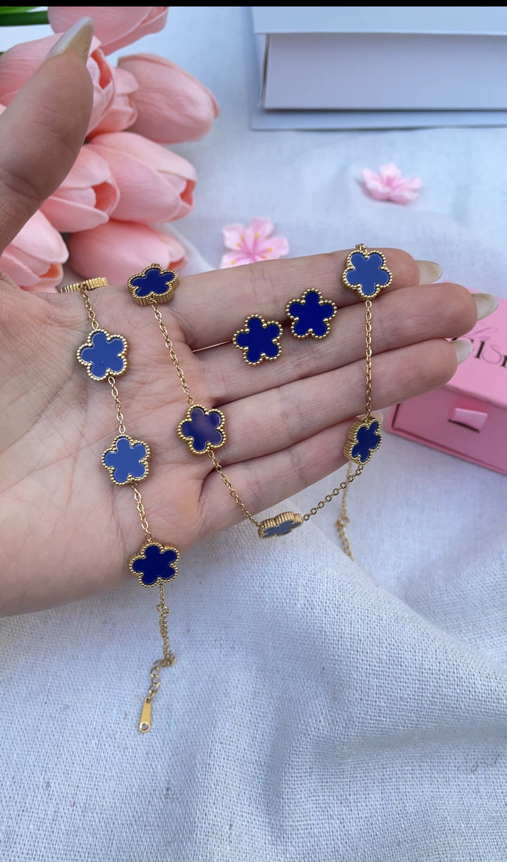 طقم الورود الكحلي يتسم بالتصميم الأنثوي المفعم بالأناقة والتناسق بين قطعه الثلاثة، ليمنح إطلالة متجانسة ورقيقة. السلسلة تحمل مجموعة من زهور كحلية اللون بأطراف متموجة محفوفة بإطار ذهبي ناعم، مما يضفي لمسة حيوية ومميزة. السوار ينساب حول المعصم بعناية ليبرز تفاصيل الورود الصغيرة، مما يخلق توازنًا مثاليًا مع السلسلة. أما الحلق فمصمم على شكل وردة واحدة كحلية اللون، محاطة بإطار ذهبي دقيق يعزز جمال التصميم. جميع القطع مطلية بالذهب عيار 18 مكفول سنة لتغير اللون.