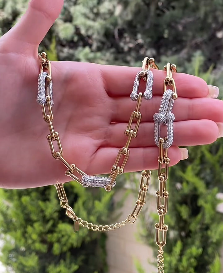 طقم تيفاني مميز يجمع بين البساطة والفخامة بتناغم متقن بين السلسلة والسوار، بتصميم سلسلة متشابكة مستطيلة الشكل تضفي لمسة عصرية وجذابة. السلسلة بقطع ذهبية مستطيلة مع تفصيلات دقيقة مطعمة بقطع فضية دقيقة وملمعة تضفي لمسة من الرقي والتميز. السوار يعكس نفس التصميم بأناقة متناسقة، محاط بقطع فضية مضلعة تضفي عليه لمسة بصرية جذابة. الطقم يتميز بلونه الذهبي الدافئ مع لمسات فضية تبرزه بطريقة راقية وفريدة. مطلي بالذهب عيار 18 مكفول سنة لتغير اللون.