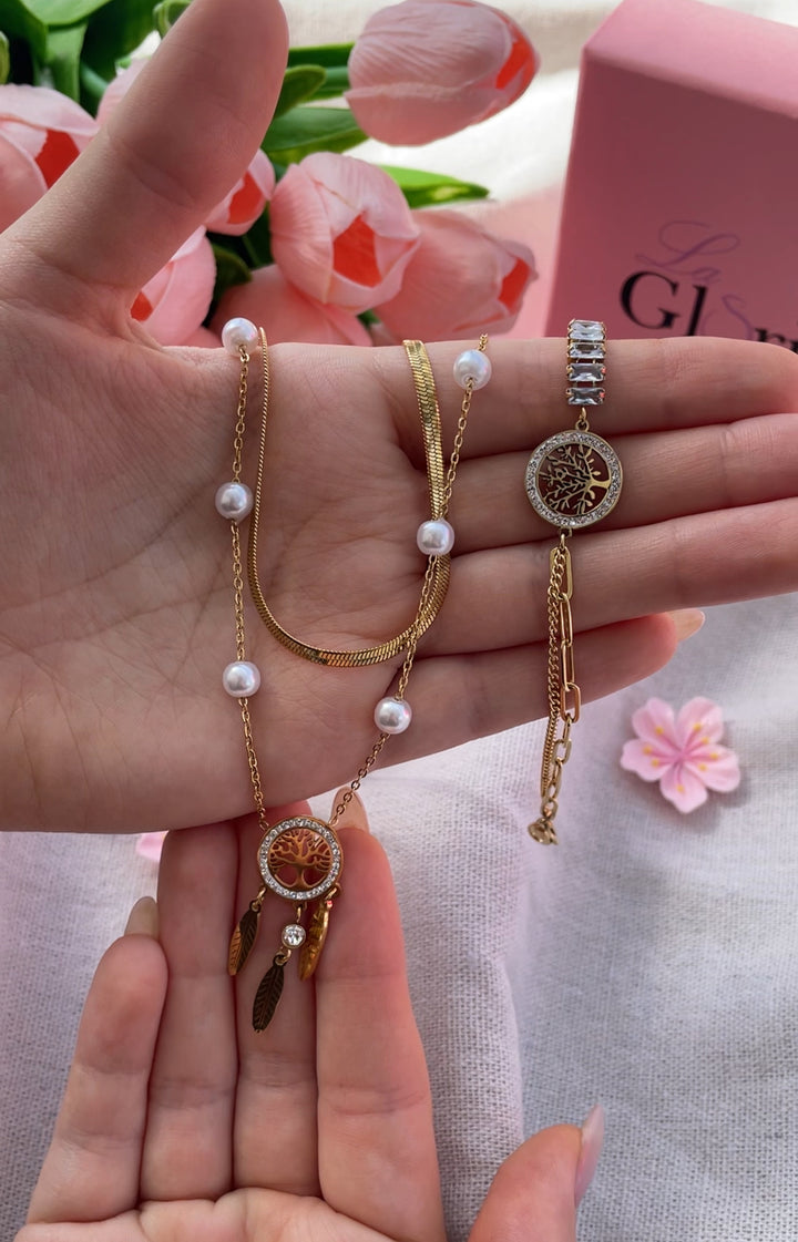 طقم شجرة الحياة اللولو بتصميم متناغم وأنيق يجمع بين روعة التفاصيل ورقة اللمسات النباتية، حيث تتناسق القطع لتعكس رمز الحياة والنمو في أبهى صورها. السلسلة الذهبية الرفيعة مزينة بعدة خرزات لؤلؤية بيضاء ناعمة، تتوسطها قلادة دائرية مزخرفة بنقش شجرة الحياة تحيط بها براقة من الأحجار الشفافة الصغيرة، مع ثلاث تعليقات على شكل ريشة وأحجار بيضاء تضفي حيوية وحركة على التصميم. السوار مكون من شريط سلسلة ذهبي عريض مع قلادة دائرية أيضًا لنفس نقش الشجرة، محاط بصف من الأحجار الشفافة وأطراف سلسلتين رقيقتين تضيفان لمسة من الأمجاد والفخامة. الطقم لون ذهبي فاخر يبرز نعومة اللؤلؤ وتلألؤ الأحجار، ليمنح إطلالة متكاملة تدفع نحو التفاؤل والحيوية. مطلي بالذهب عيار 18 مكفول سنة لتغير اللون.