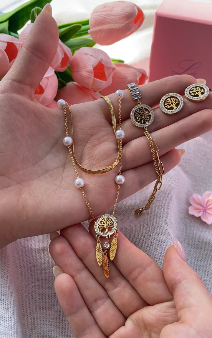 طقم أنيق يجمع بين الأناقة والرمزية في تصميم متناغم يعكس جمال شجرة الحياة مع لمسات من اللؤلؤ الندي. تتألق السلسلة بقلادة مستديرة تحمل شكل شجرة الحياة محاطة بحلقة من الألماس الصناعي، وتتدلى منها ثلاث ريشة ذهبيّة بتدرجات ناعمة تبرز الرقي والتفرد، مع تزيينها بحبات اللؤلؤ التي تمنح السلسلة بريقًا ونعومة متناهية. السوار يتسم بالبساطة والتألق، مزين بشريحة دائرية تحتوي على نقش شجرة الحياة محاطة بحلقة من الأحجار البراقة، مدعومة بسلسلة مرنة تعزز من سهولة الارتداء. أما الحلق، فيأتي بتصميم دائري متناسق مع باقي الطقم، مزين بنمط شجرة الحياة وبأحجار من الألماس الصناعي تحيط به، لإضافة لمسة من الفخامة والتميز. يأتي الطقم بلون ذهبي دافئ يضفي عليه سحرًا خاصًا، مطلي بالذهب عيار 18 مكفول سنة لتغير اللون.