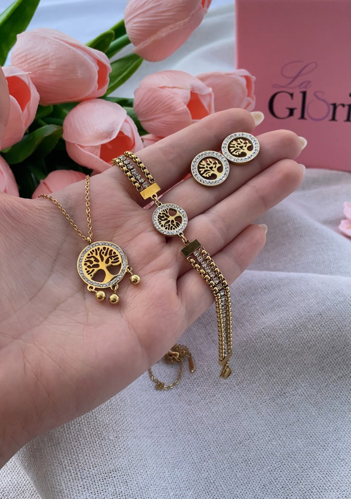 طقم شجرة الحياة الناعم يصمم بتناغم مميز يبرز جمال وتفاصيل رمز شجرة الحياة على كل قطعة، ما يضفي لمسة أنيقة ورقيقة تناسب مختلف المناسبات. السلسلة ذهبية اللون تحمل قلادة دائرية مزخرفة بشجرة الحياة وسط إطار من النقوش الرقيقة مع ثلاث حبات ذهبية تتدلى بخفة لتعزز التصميم الناعم. السوار يتألق بثلاث صفوف متداخلة من السلاسل الرفيعة ومحاطة بقطع معدنية تحمل نفس نقشة الشجرة وسط إطار لامع يبرز جمال الرمز الأيقوني. الحلق مدور أنيق ذو تصميم بسيط يضم نقشة شجرة الحياة محاطة بدائرة مقابلة من الأحجار البيضاء الصغيرة التي تضفي بريقًا ناعمًا. جميع القطع مطلية بالذهب عيار 18 مكفول سنة لتغير اللون.