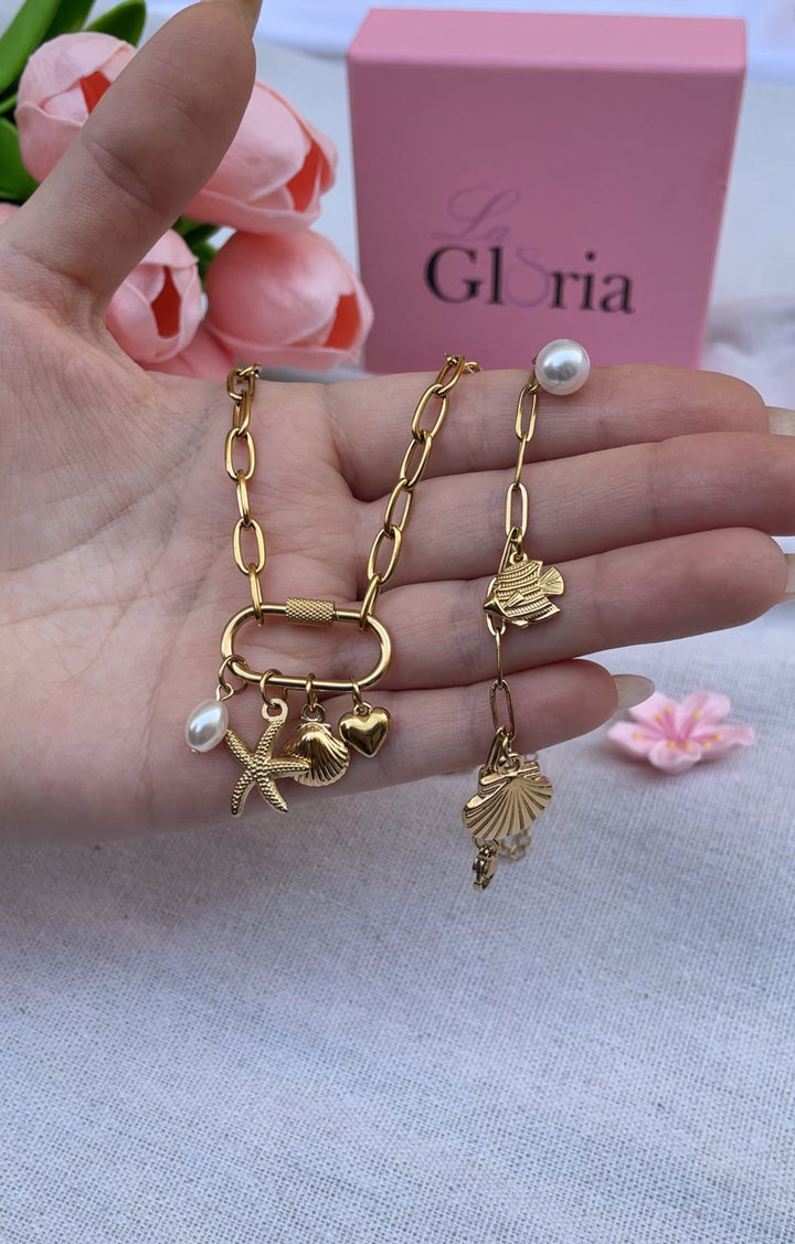 طقم كنوز البحر يتسم بتناسق أنيق يبرز جمال البحار وكنوزها الساحرة من خلال تصميمه المتكامل. السلسلة ذات الروابط المستطيلة المتباعدة تخلق توازنًا ناعمًا بين الجرأة والرقة، مزينة بشخصيات بحرية متنوعة تشمل نجمة البحر، صدفة المحار، قلب متلألئ ولؤلؤة طبيعية تضفي لمسة من النقاء والأناقة. السوار يمتاز بسلسلة خفيفة وآسرة تحمل حبات لؤلؤ متلألئة بالإضافة إلى تعليقات على شكل سمكة وصدفة بحرية ذات نقوش دقيقة تعكس الفن البحري الحقيقي. اللون الذهبي يضيف دفء ورقي للطقم، مما يجعله خيارًا مثاليًا لعشاق التصاميم المفعمة بالأنوثة والجمال الطبيعي. مطلي بالذهب عيار 18 مكفول سنة لتغير اللون.